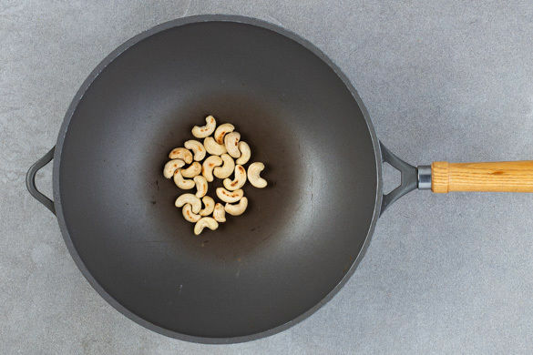 Die Cashews in einer großen Pfanne oder einem Wok ohne Zugabe von Fett bei mittlerer Hitze 1–2Min. goldbraun anrösten. Vorsicht, sie können schnell zu dunkel werden. Zum Abkühlen aus der Pfanne nehmen und beiseitestellen.