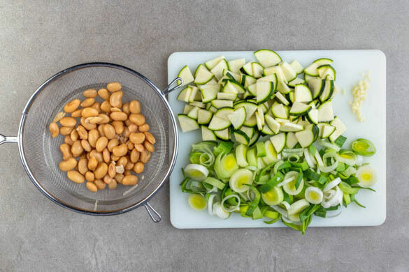 Die weißen Bohnen in einem Sieb mit kaltem Wasser abspülen und abtropfen lassen. Den Lauch in dünne Ringe schneiden. Die Zucchini längs vierteln und in dünne Scheiben schneiden. Den Knoblauch schälen und fein würfeln.