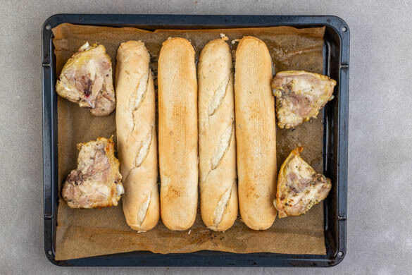 Das Fleisch wenden. Die Brötchenhälften mit der Schnittfläche durch das ausgetretene Fett ziehen und mit der Schnittseite nach oben auf das Blech legen. Das Fleisch mit den Brötchen 4–5Min. weiterbacken, bis die Brötchen leicht knusprig sind. Die Brötchen vom Blech nehmen und das Fleisch weitere ca. 10Min. backen, bis es appetitlich gebräunt und durchgegart ist.