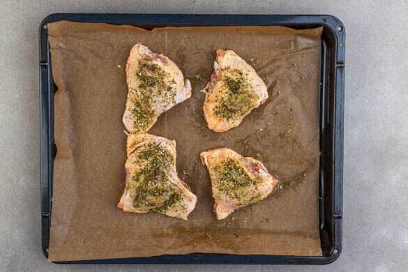 Den Backofen auf 240°C (220°C Umluft) vorheizen. Das Fleisch trocken tupfen und mit der Hautseite nach oben auf zwei mit Backpapier ausgelegte Backbleche legen. Mit 4EL Olivenöl beträufeln und mit der Knoblauch-Kräuter-Gewürzmischung und je ½TL Salz und Pfeffer bestreuen. Das Fleisch wenden und mit der Hautseite nach unten ca. 15Min. im Ofen backen.