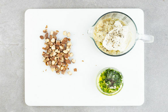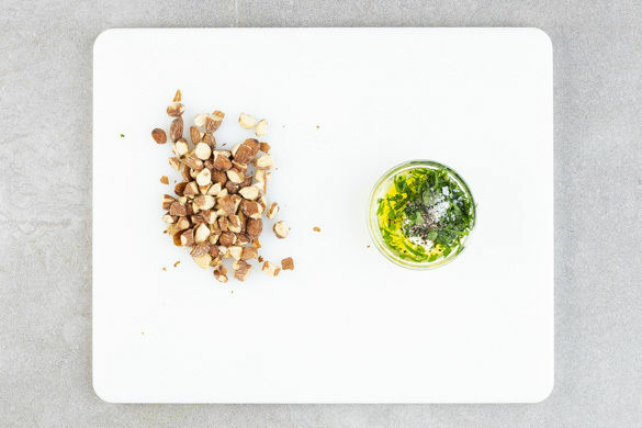 Die Rauchmandeln grob hacken. Die Petersilienblätter abzupfen, fein hacken und mit 2EL Crème fraîche, 2EL Olivenöl, 1–2EL Wasser sowie Salz und Pfeffer zu einem cremigen Dip verrühren.