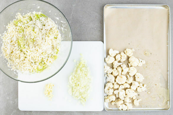 Den Ofen auf 180°C Umluft (200°C Ober-/Unterhitze) vorheizen. Die Pastinaken schälen und mit dem Sellerie und ⅔ des Blumenkohls samt Strunk grob reiben. Den restlichen Blumenkohl in 2cm große Röschen zerteilen, mit Salz, Pfeffer und 2EL Olivenöl vermengen und auf einem mit Backpapier belegten Blech 15Min. backen. Die Zwiebeln und den Knoblauch schälen und fein würfeln.