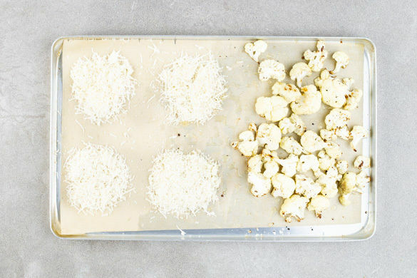 Den Käse fein reiben. Die ½ des Käses auf einem zweiten mit Backpapier belegten Backblech sowie neben den Blumenkohlröschen zu insgesamt 8 Häufchen formen, dabei auf genügend Abstand achten. Im Ofen 6–8Min. zu Käsetalern backen, dann aus dem Ofen nehmen und abkühlen lassen.