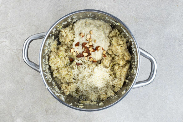 Nach ca. 15Min. Kochzeit die Hitze auf die niedrigste Stufe reduzieren und in einem hohen Messbecher ca. 150ml des Blumenkohlrisottos mit 2EL Butter oder Olivenöl sowie der restlichen Crème fraîche cremig pürieren. Das Blumenkohlpüree zurück in den Topf geben und das Blumenkohlrisotto bei geringer Hitzezufuhr weitere 10Min. sanft köcheln lassen.