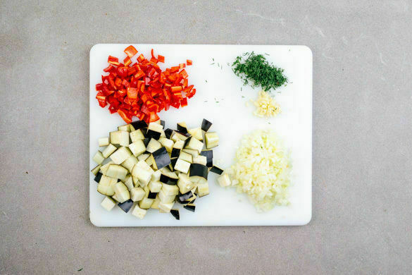 Die Zwiebel schälen, halbieren und in feine Würfel schneiden. Den Knoblauch schälen und fein hacken. Die Auberginen in ca. 1cm große Würfel schneiden. Die Paprika vierteln, entkernen und ebenfalls würfeln. Den Dill samt Stängeln fein schneiden.