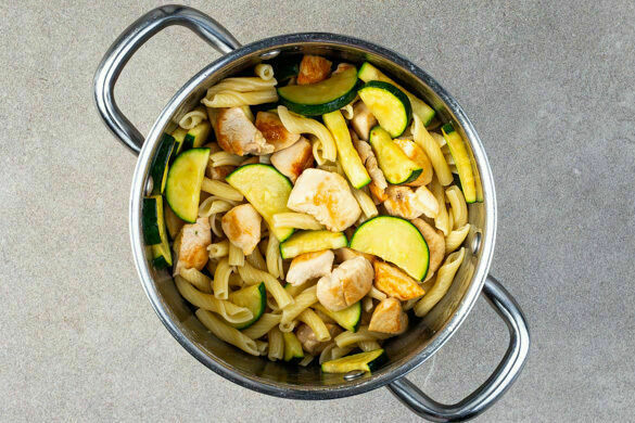 Die Pasta in das kochende Wasser geben und in 8–10Min. bissfest kochen. 150ml Kochwasser abschöpfen, dann die Pasta in ein Sieb abgießen und abtropfen lassen. Die Pasta und 150ml Kochwasser zurück in den Topf geben, das fertig gebratene Fleisch und die Zucchini hinzufügen.
