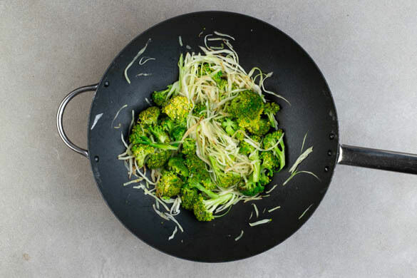 In einem mittelgroßen Topf ausreichend gesalzenes Wasser für die Nudeln zum Kochen bringen. Den Brokkoli in kleine Röschen schneiden. Den Ingwer schälen und in feine Stifte schneiden.