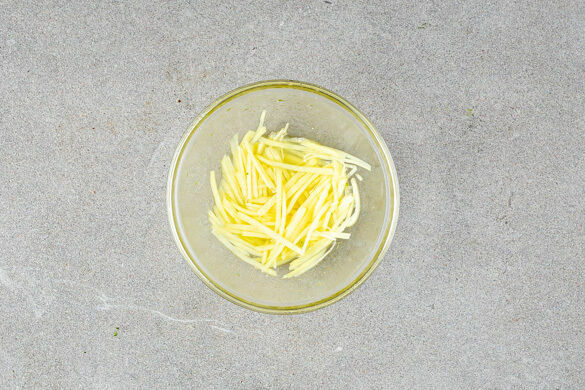 Die Nudeln in das kochende Wasser geben und in 2–3Min. bissfest kochen. Zwischendurch umrühren, um die Nudeln voneinander zu trennen. In ein Sieb abgießen und kalt abschrecken.