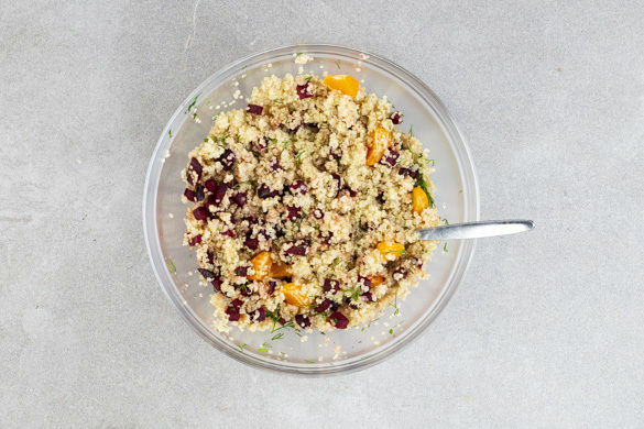 Die Rote Bete, die Mandarinen und den Dill unter die Quinoa mengen. Mit 2EL Olivenöl und Salz abschmecken. Das Fleisch in Tranchen schneiden und mit der Rote-Bete-Mandarinen-Quinoa und den Süßkartoffeln anrichten. Mit dem Joghurtdip und den Lauchzwiebeln garnieren und servieren.