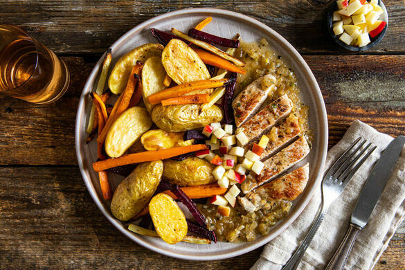 Die Schnitzel in Streifen schneiden und mit der Sauce und dem Gemüse auf Teller verteilen. Mit der Apfelsalsa garnieren und servieren.