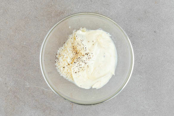 Den Käse grob reiben. Die Zitrone halbieren und auspressen. Die Crème fraîche mit der ½ des Käses, ½TL Zitronensaft und je 1 Prise Salz und Pfeffer verrühren.