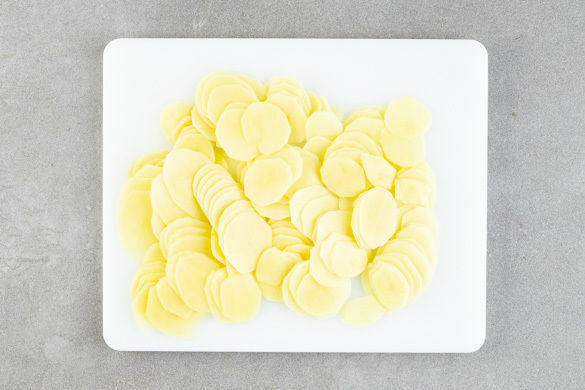 Die Kartoffeln schälen und in sehr dünne Scheiben schneiden oder hobeln.