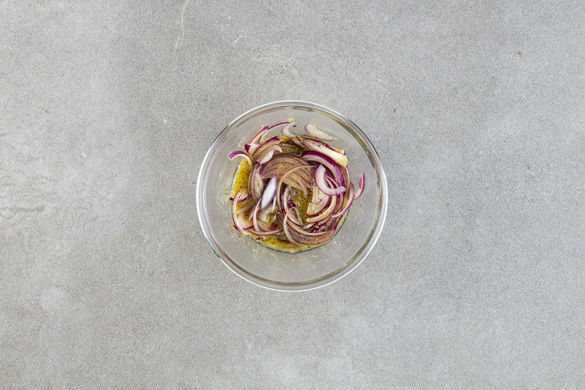 Den Backofen auf 240°C (220°C Umluft) vorheizen. Den Salat in feine Streifen schneiden. Die Zwiebeln schälen und halbieren, drei Hälften in feine Würfel, eine Hälfte in feine Streifen schneiden. Den Knoblauch schälen und in hauchdünne Scheibchen schneiden.