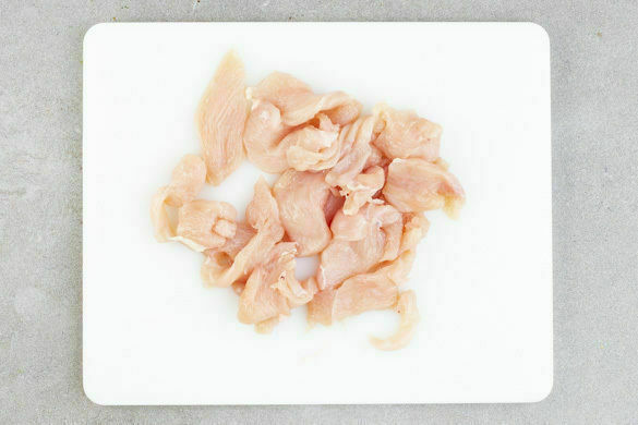 Das Fleisch trocken tupfen, jeweils längs halbieren und quer in dünne Scheiben schneiden.