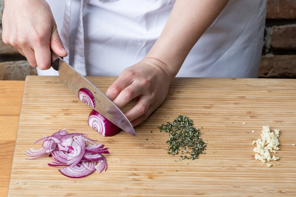 Die Zwiebel schälen, halbieren und in feine Streifen schneiden. Den Knoblauch schälen und fein würfeln. Die Rosmarinnadeln von den Stängeln zupfen und fein schneiden.