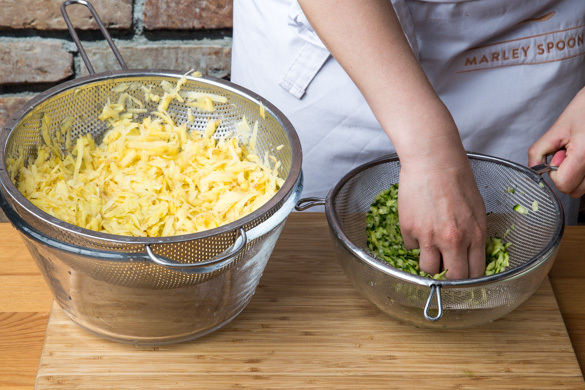 Den Backofen auf 240°C (220°C Umluft) vorheizen. Die ½ der Kartoffeln schälen und grob raspeln. Die restlichen Kartoffeln werden für dieses Rezept nicht benötigt. Die Zucchini ebenfalls grob raspeln, mit ½TL Salz vermengen und ca. 5Min. ziehen lassen, dann die überschüssige Flüssigkeit über einem Sieb auswringen.