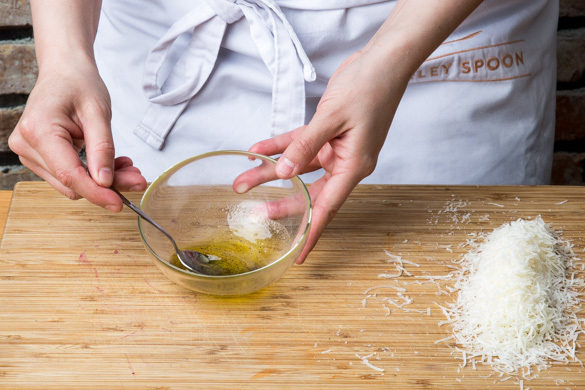 Aus 2EL Olivenöl, 2EL Essig sowie je 1 Prise Salz, Pfeffer und Zucker ein Dressing anrühren. Den Käse fein reiben.