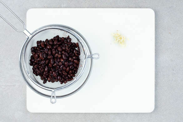 Die Bohnen in ein Sieb abgießen, kalt abspülen und abtropfen lassen. Den Knoblauch schälen und fein würfeln.
