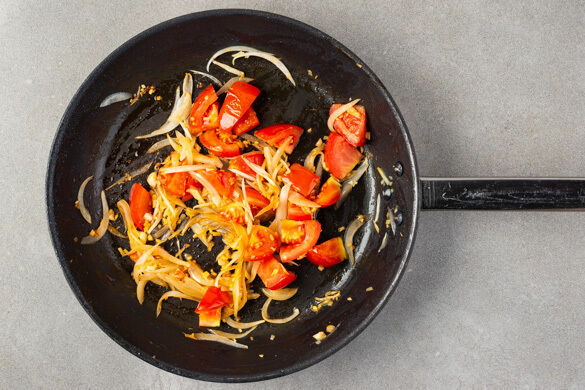 Den Ingwer und den Knoblauch schälen und fein reiben. Die Zwiebel schälen, halbieren und in feine Streifen schneiden. Die Tomate vierteln und in 1–2cm große Stücke schneiden. In einem kleinen Topf ausreichend gesalzenes Wasser für die Nudeln aufkochen.