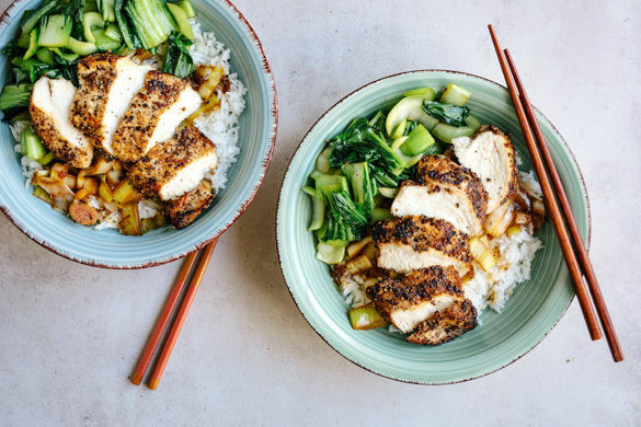 Das Fleisch in Tranchen schneiden und mit dem Lauch und dem Pak Choi auf dem Kokosreis anrichten. Nach Belieben mit mehr Pfeffer würzen und servieren.