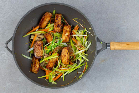 Den Tofu in einer großen Pfanne oder einem Wok mit 1EL Pflanzenöl bei mittlerer Hitze ca. 5Min. knusprig anbraten. Die Karotten und den Knoblauch dazugeben und ca. 1Min. mitbraten, dann den Lauch und die Pilze untermengen.