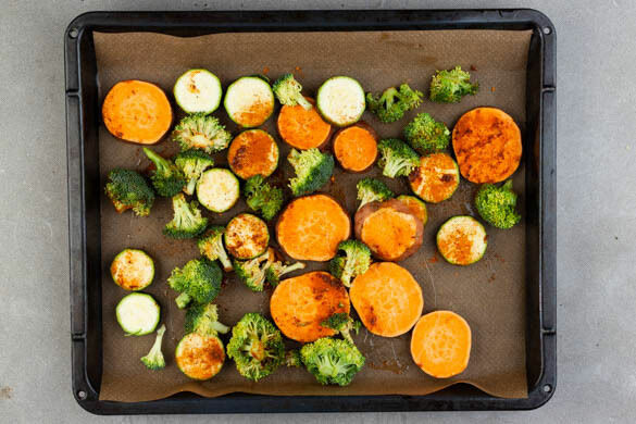 Den Backofen auf 220°C (200°C Umluft) vorheizen. Die Zucchini in 0,5–1cm dicke Scheiben schneiden. Den Brokkoli in mundgerechte Röschen zerteilen, den Strunk ggf. schälen und klein schneiden. Die Süßkartoffel samt Schale in ca. 1cm dicke Scheiben schneiden.