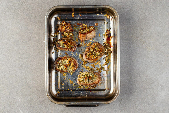 Die Kräuter-Mandel-Butter auf die Medaillons streichen, etwas andrücken und die Medaillons 6–8Min. übergrillen. Tipp: Wer keine ofenfeste Pfanne hat, kann die Medaillons auch in eine Auflaufform geben.