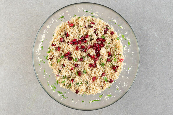 Den Granatapfel halbieren, über einer mit Wasser gefüllten Schüssel aufbrechen und die Kerne unter Wasser auslösen. Das Pulen im Wasser verhindert, dass sich Saft in der Küche verteilt. Die schwimmenden Häutchen mit einem Löffel abschöpfen, die Kerne in ein Sieb abgießen. ⅔ der Kerne, die Petersilie, 1–2EL Zitronensaft und 2EL Olivenöl unter den Couscous mengen.