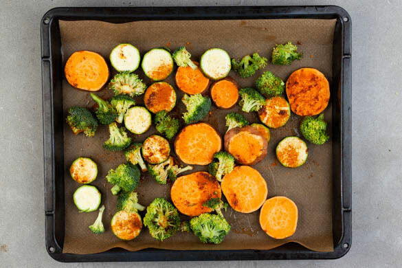 Den Backofen auf 220°C (200°C Umluft) vorheizen. Die Zucchini in 0,5–1cm dicke Scheiben schneiden. Den Brokkoli in mundgerechte Röschen zerteilen, den Strunk ggf. schälen und klein schneiden. Die Süßkartoffeln samt Schale in ca. 1cm dicke Scheiben schneiden.