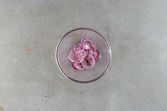 Die Zwiebel schälen, halbieren und in dünne Ringe schneiden. Die Zwiebelringe gründlich mit 1EL Essig und 2 Prisen Salz verkneten und beiseitestellen.