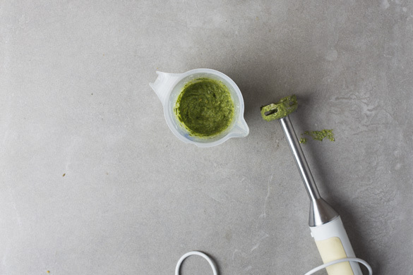 Das Basilikum samt Stängeln grob schneiden. Die Cashewkerne grob hacken. Das Basilikum, die Cashews und die ½ des Käses mit 2EL Olivenöl und 2–3EL Wasser in einem hohen Gefäß mit einem Stabmixer zu einem Pesto pürieren und mit etwas Salz und Pfeffer abschmecken.