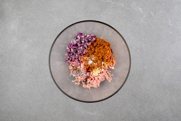 Die Zwiebeln und den Knoblauch mit dem Hackfleisch vermischen. Die Hackmasse mit der ½ der Gewürzmischung sowie je 1 Prise Salz und Pfeffer würzen, anschließend 10–12 kleine Hackbällchen formen.