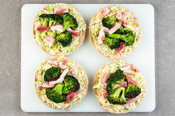 Den Lauch vom Herd nehmen und mit 1 kräftigen Prise Pfeffer würzen. Die Crème fraîche und den Käse unterrühren und den Käse-Lauch-Mix gleichmäßig auf 8 Pitas verteilen. Den Brokkoli und den Speck darauf anrichten.