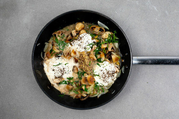 Die Pilze in derselben Pfanne mit 1EL Olivenöl bei mittlerer Hitze 3–5Min. anbraten. Die Zwiebeln hinzufügen und 1–2Min. mitbraten. 1EL Mehl unterrühren und mit 200–300ml Wasser ablöschen. Die ½ des Brühgewürzes in der Sauce auflösen, dann den Violife Creamy und das Fleisch hinzugeben und das Geschnetzelte 1–2Min. köcheln lassen.