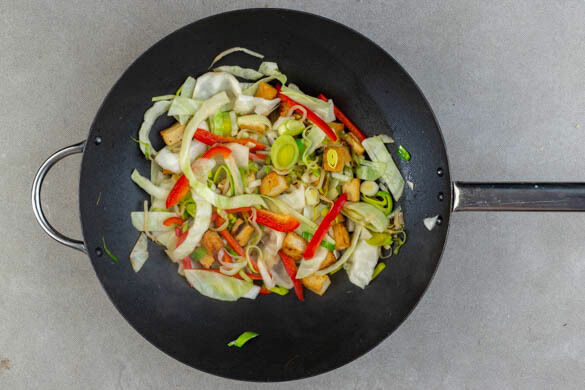 Die Paprika vierteln, entkernen und in dünne Streifen schneiden, dann mit dem Gemüsemix zum Tofu in die Pfanne geben und bei starker Hitze 2–4Min. mitbraten, bis das Gemüse weich wird.