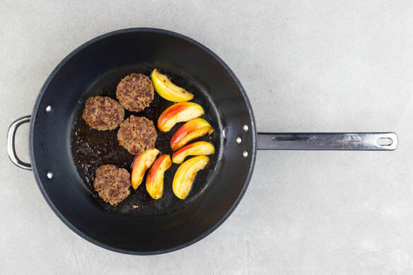 Die Hackbällchen und die Apfelspalten in einer großen Pfanne mit 1EL Pflanzenöl bei starker Hitze ca. 3Min. anbraten, wenden und auf der anderen Seite ca. 2Min. weiterbraten. Aus der Pfanne nehmen und abgedeckt auf einem Teller warm halten, die Pfanne wird weiterverwendet.