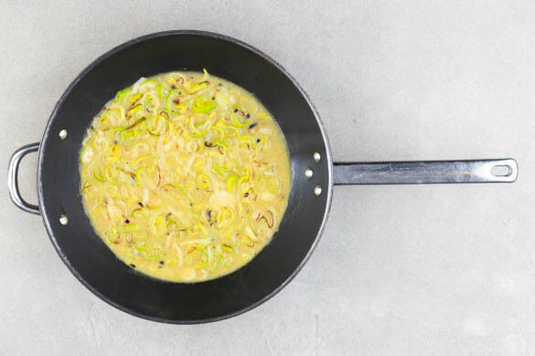 In einer zweiten großen Pfanne den Lauch mit 1 Prise Salz und 1EL Pflanzenöl bei starker Hitze ca. 2Min. braten. 1EL Mehl darüberstäuben und unterrühren. 300ml Wasser angießen und die restliche Gewürzmischung und 1EL Senf einrühren. Die Hitze reduzieren und die Sauce bei mittlerer Hitze 7–9Min. köcheln lassen, dabei gelegentlich umrühren.