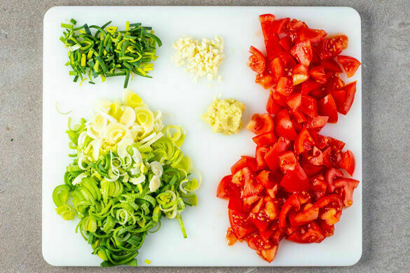 In einem großen Topf ausreichend gesalzenes Wasser für die Nudeln zum Kochen bringen. Den Lauch längs halbieren und in feine Streifen schneiden. Etwa 4EL dunkelgrüne Lauchstreifen für die Garnitur beiseitelegen. Den Knoblauch schälen und fein würfeln oder reiben. Den Ingwer schälen und fein reiben. Die Tomaten grob würfeln.