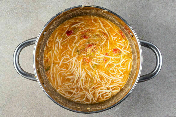 Die Nudeln in das kochende Wasser geben und in 5–6Min. bissfest kochen. In ein Sieb abgießen und kalt abschrecken. Die Nudeln mit einer Schere in 4–5cm lange Stücke schneiden.