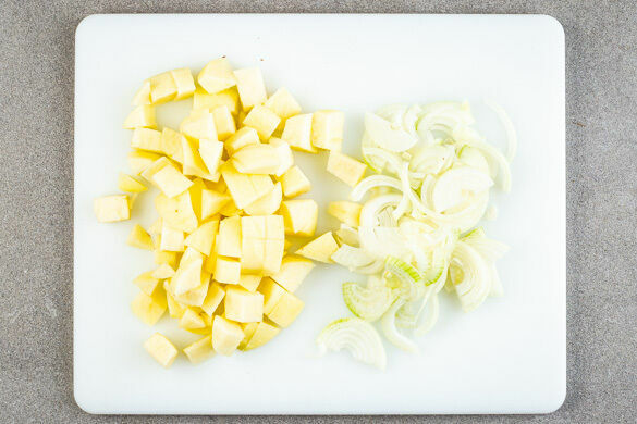 Den Apfel schälen und in 1–2cm große Würfel schneiden, dabei das Kerngehäuse entfernen. Die Zwiebel schälen, halbieren und in dünne Streifen schneiden.