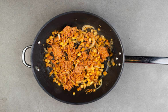 Inzwischen die Äpfel und die Zwiebeln in einer mittelgroßen Pfanne mit 1EL Olivenöl bei mittlerer Hitze ca. 7Min. anbraten, dabei gelegentlich umrühren. 100ml Wasser angießen, dann 1EL Essig und 1TL Zucker einrühren und die Äpfel abgedeckt 5–6Min. köcheln lassen, bis das Wasser verdampft ist. Das Fleisch untermengen und mit Salz und Pfeffer abschmecken.