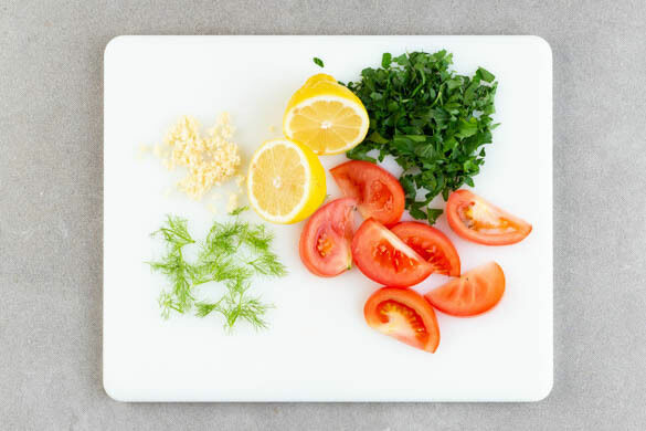Den Knoblauch schälen und fein würfeln. Die Tomaten in ca. 0,5cm dicke Spalten schneiden. Die Petersilie samt Stängeln grob schneiden. Die Zitrone halbieren und eine Hälfte auspressen, die andere Hälfte wird für dieses Rezept nicht benötigt.