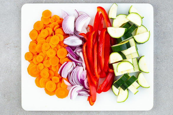 Die Zucchini längs halbieren und quer in breite Scheiben schneiden. Die Paprika vierteln, entkernen und in dünne Streifen schneiden. Die Zwiebel schälen, halbieren und in feine Streifen schneiden. Die Karotte ggf. schälen und in dünne Scheiben schneiden.