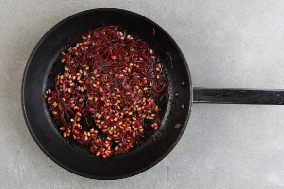 Die ½ der Granatapfelkerne zu den Zwiebeln in die Pfanne geben und ca. 4Min. weiter braten. 4EL Balsamicoessig und 1TL Honig hinzufügen und bei starker Hitze ca. 1Min. köcheln lassen, bis eine klebrige Zwiebelmarmelade entsteht.