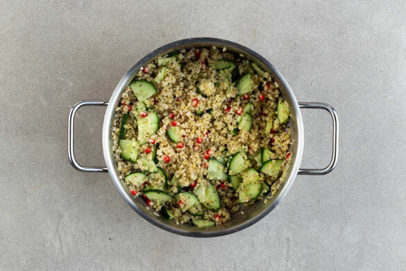 Die Gurke längs vierteln und quer in ca. 1cm dicke Scheiben schneiden. Den Bulgur mit den Gurken und den übrigen Granatapfelkernen vermengen, anschließend mit Salz und Pfeffer abschmecken. Das Fleisch in Scheiben schneiden. Den Bulgur auf Teller verteilen, dann den Blumenkohl und das Fleisch darauf anrichten. Mit der Zwiebelmarmelade garnieren und servieren.