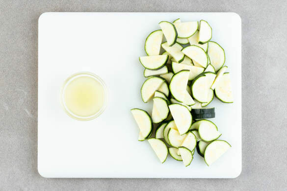 In einem mittelgroßen Topf ausreichend gesalzenes Wasser für die Pasta zum Kochen bringen. Die Zucchini längs halbieren und in ca. 1cm dicke Scheiben schneiden. Die Zitrone halbieren und auspressen.