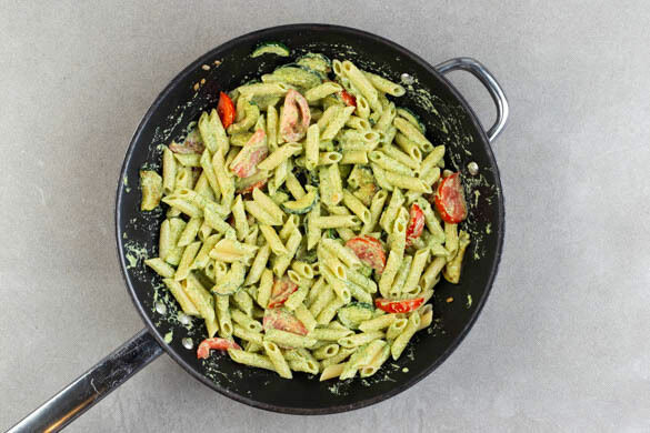 Unsere Penne macht müde Geister wieder munter: Zitronige Noten und frische Kräuteraromen von Petersilie und Dill lassen das leichte Pesto mit gerösteten Sonnenblumenkernen auf deiner Zunge tanzen. Sanft gegarte Zucchini und Tomatenspalten liegen auch nicht schwer im Magen, dafür wird uns aber der rauchige Lachs lange in Erinnerung bleiben – sie schmecken zu dem Pesto einfach köstlich!