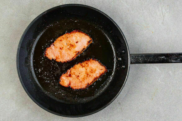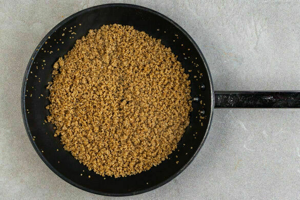In der Kürbiskernpfanne das Fleisch mit 2EL Pflanzenöl bei mittlerer bis starker Hitze auf jeder Seite 2–3Min. anbraten, samt ausgetretenem Saft aus der Pfanne nehmen und kurz beiseitestellen. Die Pfanne nicht auswischen.