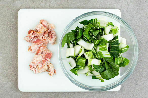 Den weißen Teil des Pak Choi in ca. 0,5cm breite, den grünen Teil in ca. 1cm breite Stücke schneiden. Den Bacon in 0,5–1cm breite Streifen schneiden.