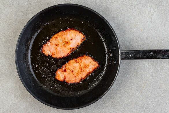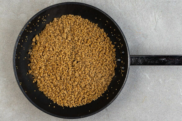 In der Kürbiskernpfanne das Fleisch mit 1EL Pflanzenöl bei mittlerer bis starker Hitze auf jeder Seite 2–3Min. anbraten, samt ausgetretenem Saft aus der Pfanne nehmen und kurz beiseitestellen. Die Pfanne nicht auswischen.